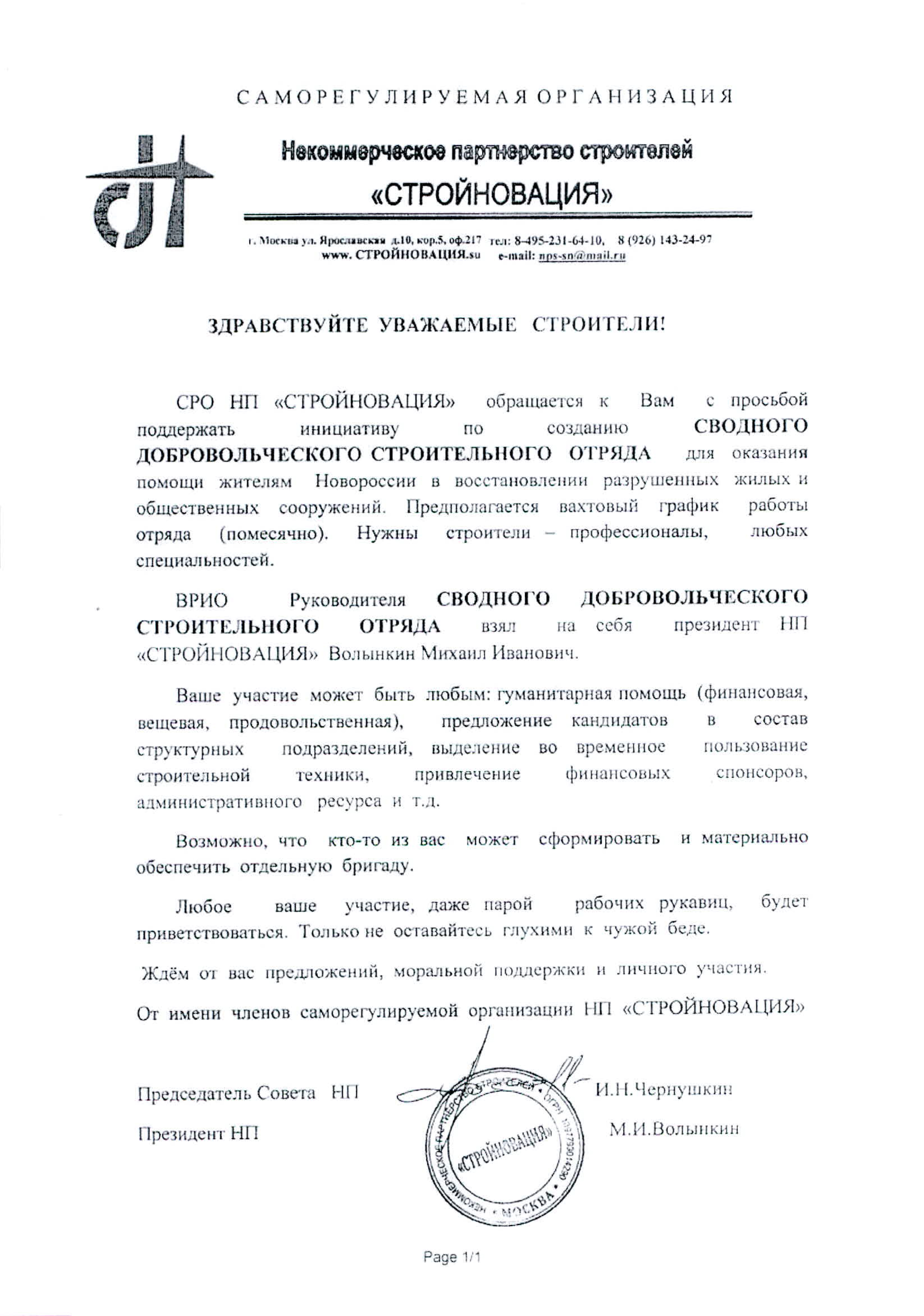 Приложение: Письмо от СРО НП «СТРОЙНОВАЦИЯ» 1 л. в 1 экз.